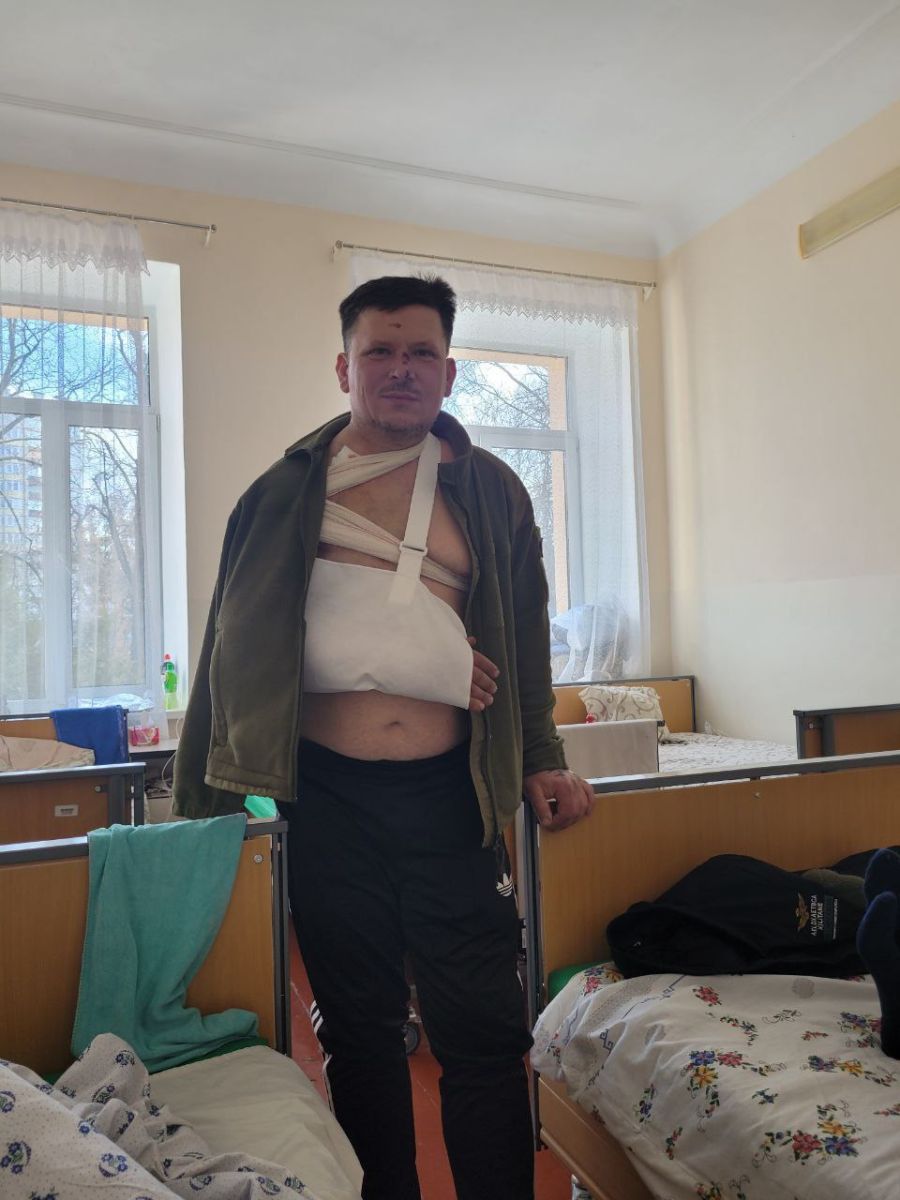 “I was unconscious for a period, and when I regain consciousness, I was glad to be alive,” shares Viktor Kostiuchyk. “Concussion, severe headache, ringing and tinnitus. I felt shrapnel in my shoulder and thigh, and saw a dislocated shoulder. My right hand was laying strangely on the ground, and only my little finger was moving. Most likely, I was thrown back a few meters and crashed into the wall, because I was next to it.