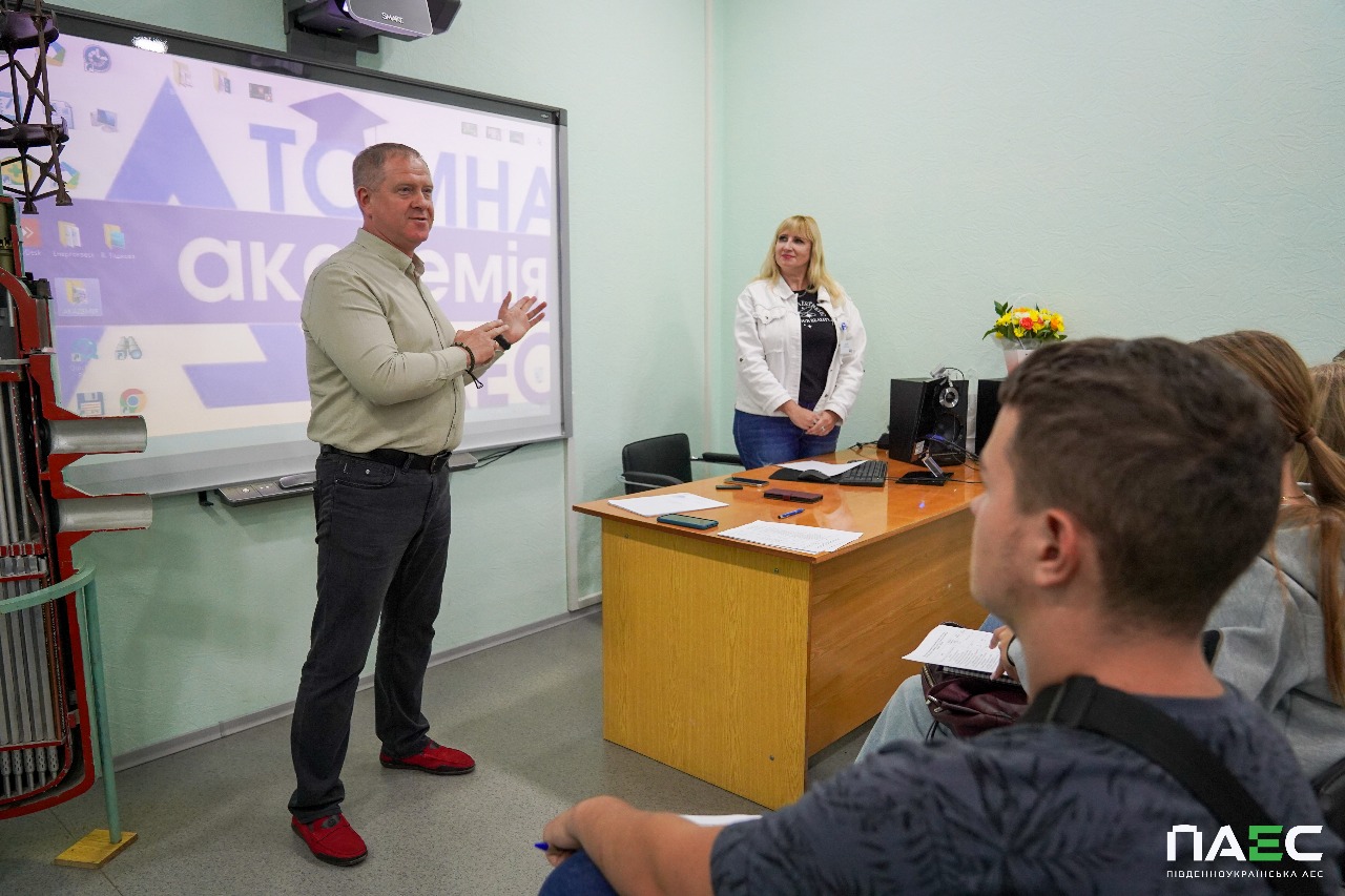 Представники всіх п’яти міських ліцеїв, які цьогоріч вирішили стати студентами Атомної академії ПАЕС, отримали від кураторів усю необхідну інформацію щодо подальшого навчання і прослухали вступну лекцію, в перебігу якої ознайомилися з Південноукраїнським енергокомплексом, його історією та діяльністю. Дізналися також про переваги «атомного» навчання - стажування безпосередньо на Південноукраїнській АЕС, практичні навички роботи в сфері атомної енергетики, отримали інформацію про найсучасніші технології, які використовуються в атомній галузі, інновації в світі атомної енергетики, можливість поспілкуватися з досвідченими професіоналами, які поділяться своїми знаннями та нададуть поради, які допоможуть зробити правильний вибір майбутньої професії. Багатьох з-поміж більш як тридцяти хлопців і дівчат - нових «академіків» - цікавлять саме кар’єрні перспективи: знайти роботу до душі та ще й у високотехнологічній і стабільній галузі, яка постійно розвивається, стати частиною команди, що будує майбутнє енергетики України.