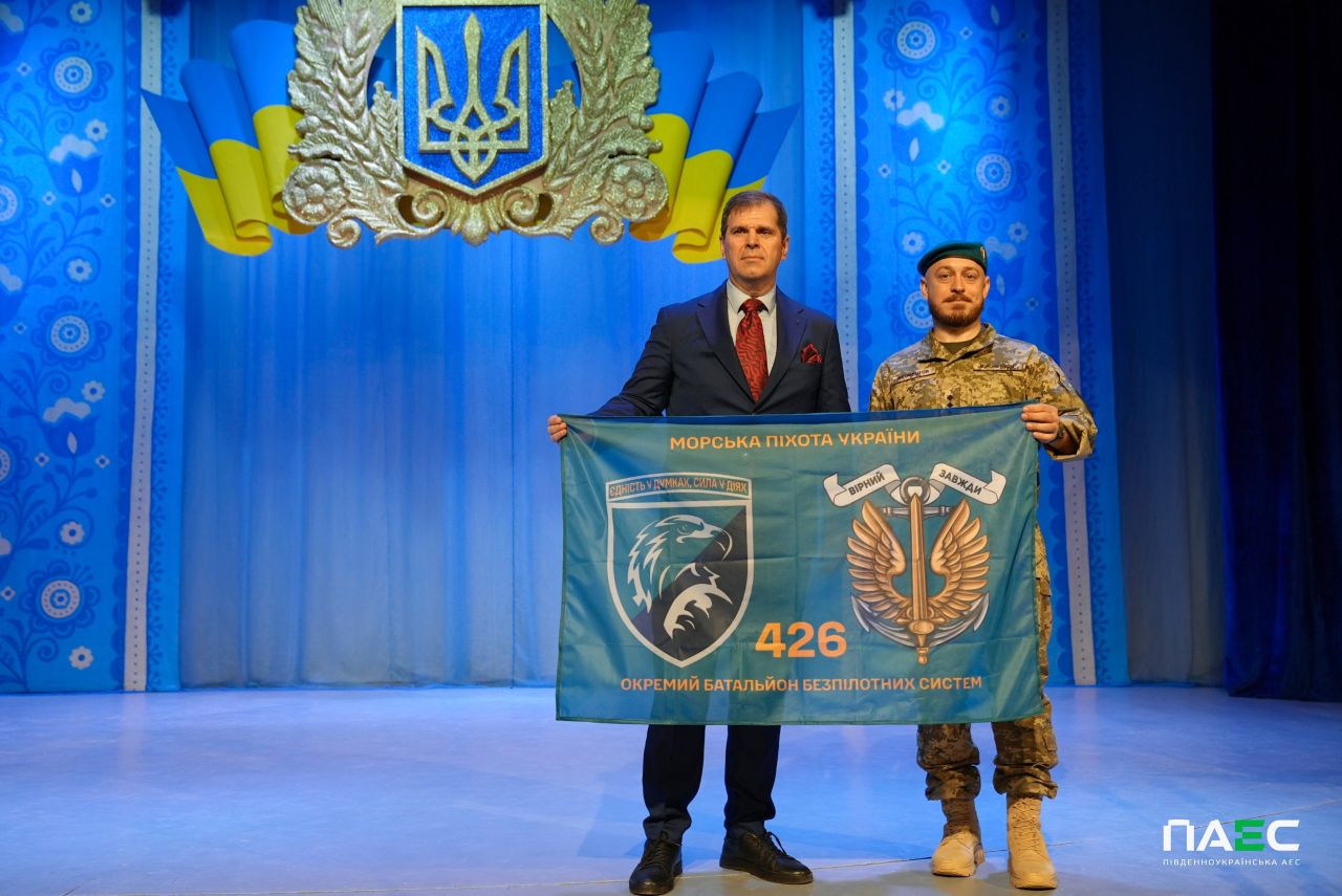 Не обійшлося і без приємних сюрпризів. Привітати колег завітав Олексій Феофентов - головний технолог ПАЕС, а нині офіцер ЗСУ, який виборює свободу для українців на передових позиціях. Військовий подарував колективу енергетиків прапор свого підрозділу - 426-го окремого батальйону безпілотних систем, подякував за чималу допомогу війську і зазначив, що матеріальна підтримка, нарівні з моральною, є дуже цінним фактором для українських оборонців. Зі свого боку генеральний директор ПАЕС Вячеслав Стоянов висловив глибоку вдячність захисникам і зазначив, що нинішнього року колектив Південноукраїнського енергокомплексу надав військової допомоги на більше як 75 млн грн. Він також нагадав, що боротьба продовжується і для усіх, хто в тилу, допомога фронту має стати святим обов’язком.